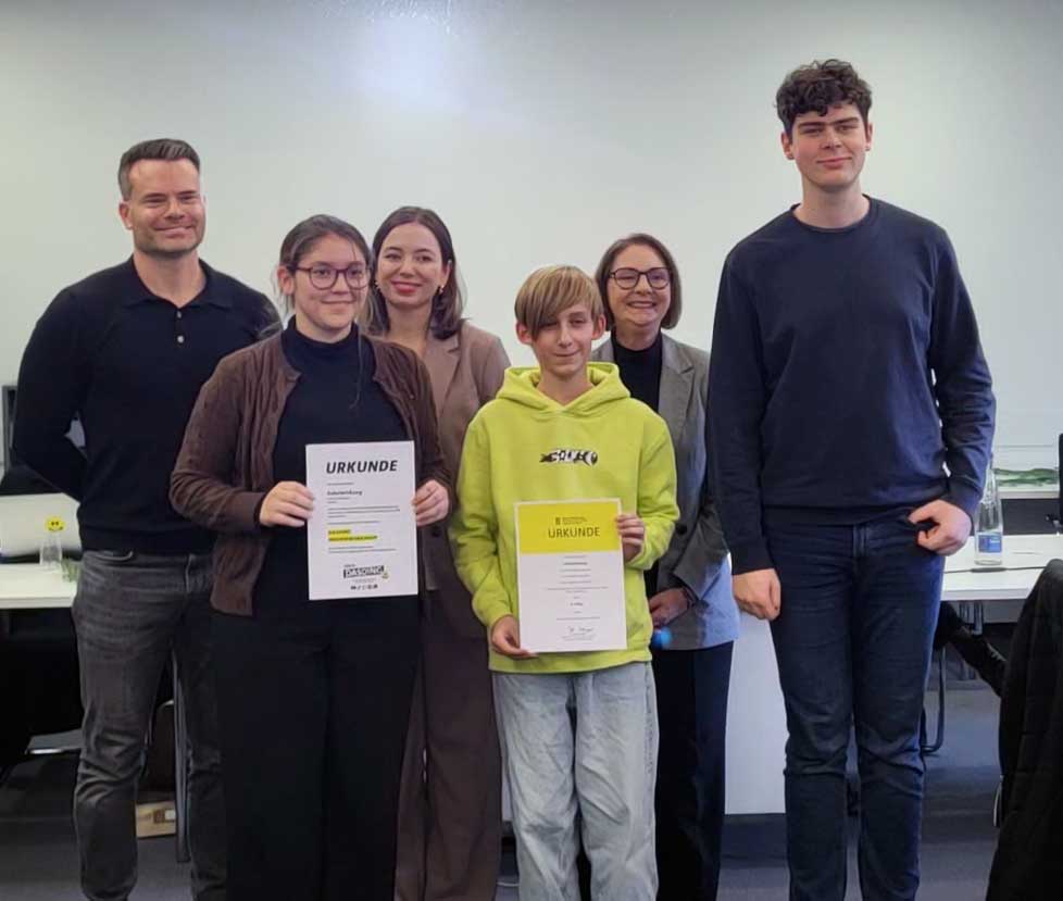 Die Hebelwirkung ist mit ihrer Ausgabe "Kunterbunt" als beste Schülerzeitung Baden-Württembergs ausgezeichnet worden. Staatssekretärin Sandra Boser MdL (zweite von rechts) überreichte der Redaktion am Freitag, 12. Dezember 2025, im Kultusministerium in Stuttgart den Preis für den ersten Platz in der Kategorie Gymnasien.